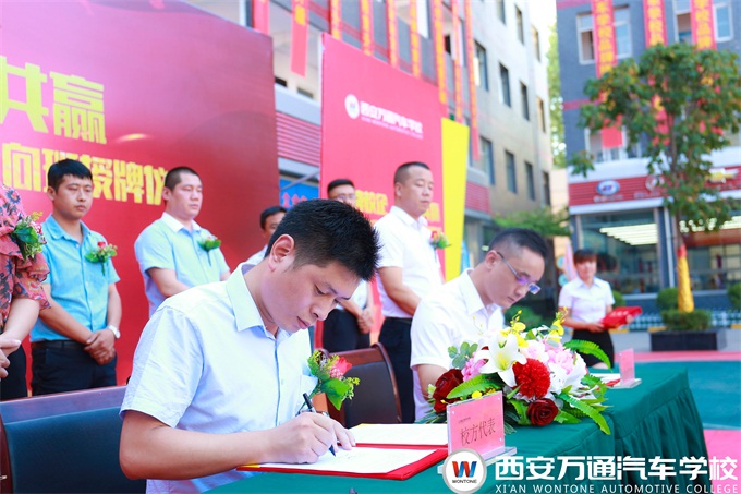 2017年7月24日,西安萬通汽車學校成功舉辦了西安萬通2017年校企合作簽約暨“校企合作實訓基地”授牌儀式,西安萬通方宏剛校長、李剛主任以及魏剛主任出席簽約儀式。出席的名企有中鑫之寶汽車服務連鎖、陜西七星車友汽車服務連鎖、鎮安遠航汽車服務有限公司、陜西卡爾汽車服務連鎖等10家知名企業。