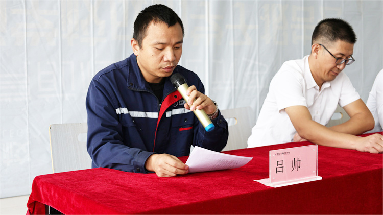 隨后,學生代表胡木林森(新能源2302班)上臺發言。他表達了對學校與企業提供實習機會的感激之情,并代表全體實習生鄭重承諾:將以“空杯心態”投入學習,嚴守企業紀律,注重團隊協作,用實際行動展現萬通學子的專業素養與精神風貌。他的發言真摯有力,道出了同學們共同的心聲與對未來的堅定信念。