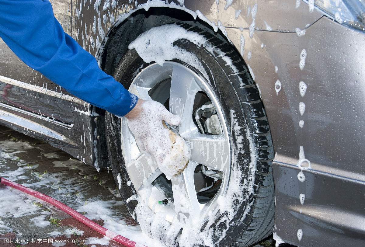 7、同時用羊毛手套按部位擦洗保險杠以上泡沫,每一部位擦洗完畢后必須清洗羊毛手套;用普通海綿擦洗保險杠以下部位,每一部位擦洗完畢后,必須清洗海綿,然后用板刷和另一塊普通海綿清洗輪胎及輪轂。