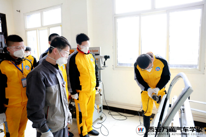 西安萬通汽車學校新學期教學體驗課持續激情開展,2017年2月8日中午,鈑噴教學組郭老師為2017屆新同學上演了一場專業而又刺激的汽車微整形修復盛會。