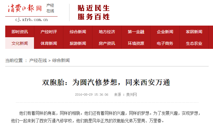 【消費日報網】雙胞胎:為圓汽修夢想,同來西安萬通
