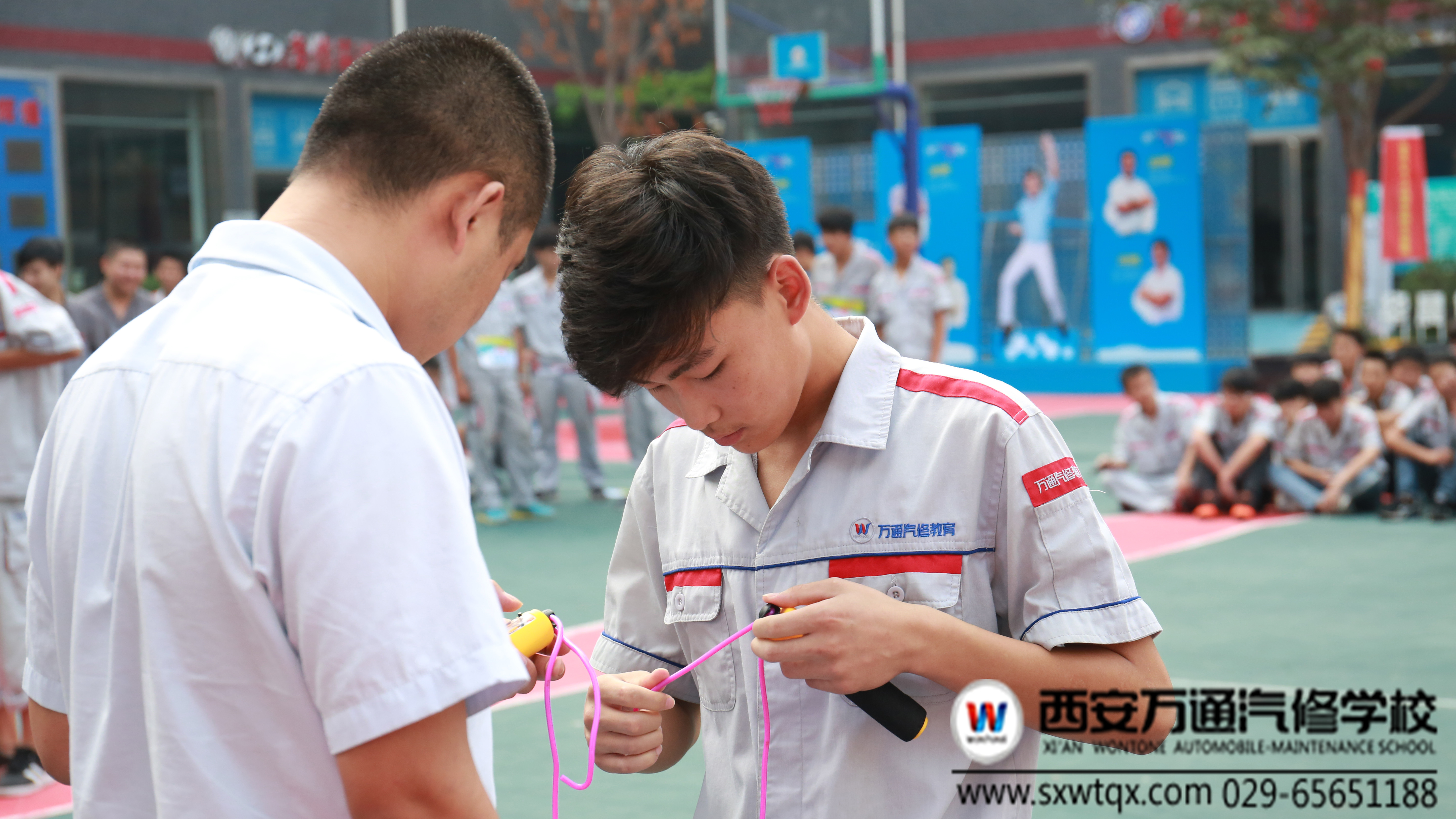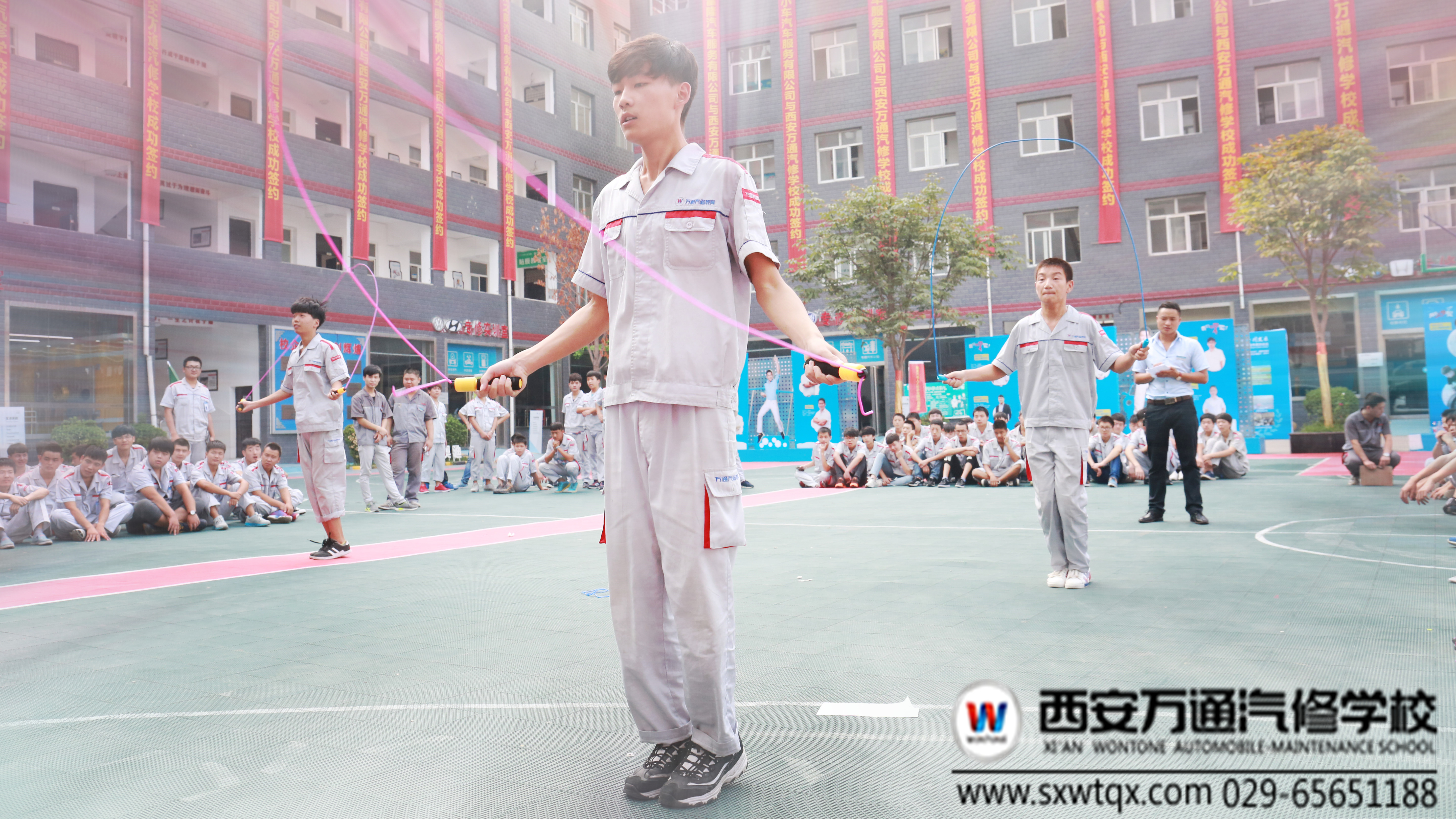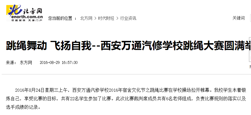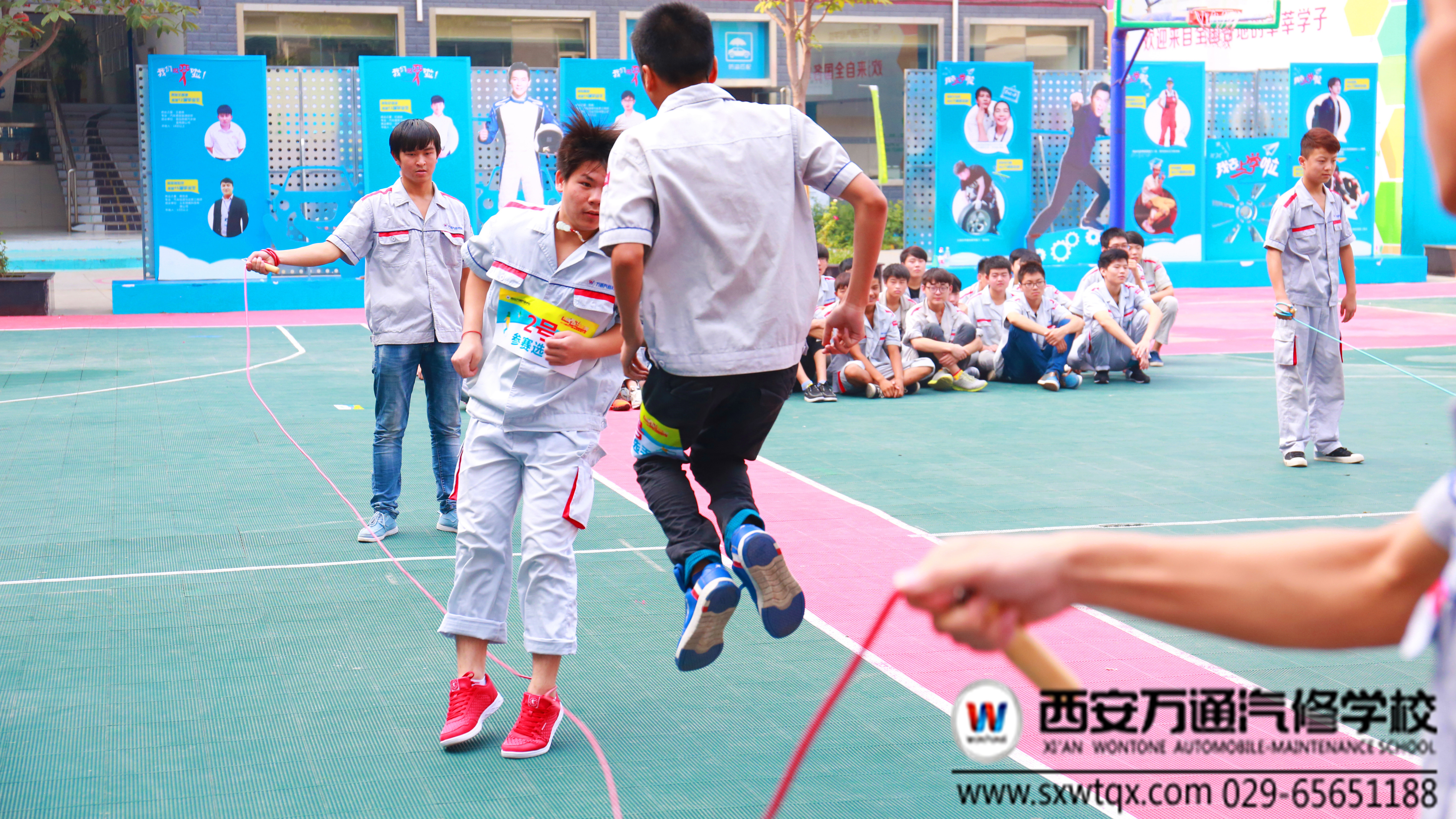 2016年8月24日星期三上午,西安萬通汽修學校2016年宿舍文化節之跳繩比賽在學校操場拉開帷幕。我校學生本著鍛煉自己,享受比賽的目標,共有22名學生參加了比賽。此次比賽裁判席成員共有6名老師組成,負責比賽規則的落實以及選手成績的記錄。
