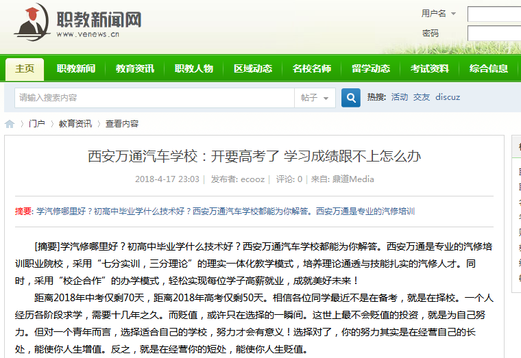 而選擇的學校決定究竟能否鯉魚躍龍門,因此擇校至關重要,可得仔細斟酌,慎重考慮。學校一個沒選好,直接成為終生的遺憾,等畢業找工作的時候,你就知道選錯專業、學校的痛苦。什么是好學校呢?簡單來說:所選專業,要好就業、專業能力強、能學到東西。學長學姐聯袂推薦這里——西安萬通汽車學校。