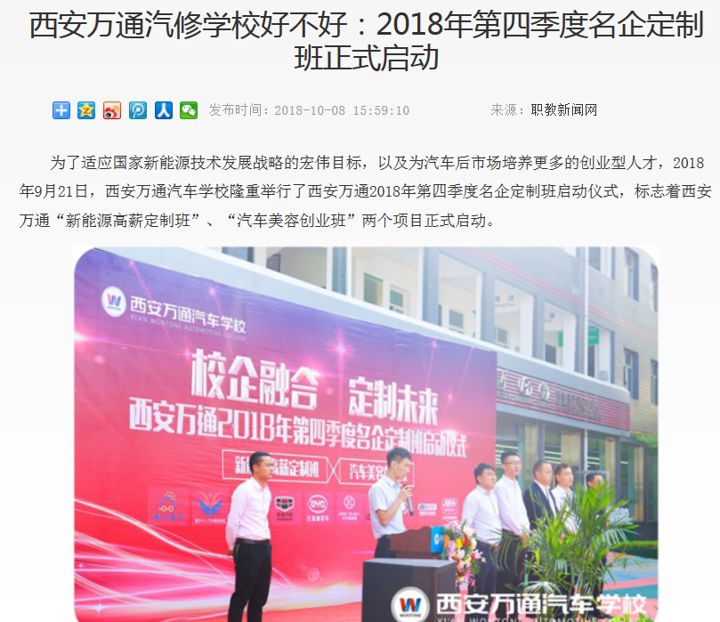 為了適應國家新能源技術發展戰略的宏偉目標,以及為汽車后市場培養更多的創業型人才,2018年9月21日,西安萬通汽車學校隆重舉行了西安萬通2018年第四季度名企定制班啟動儀式,標志著西安萬通“新能源高薪定制班”、“汽車美容創業班”兩個項目正式啟動。