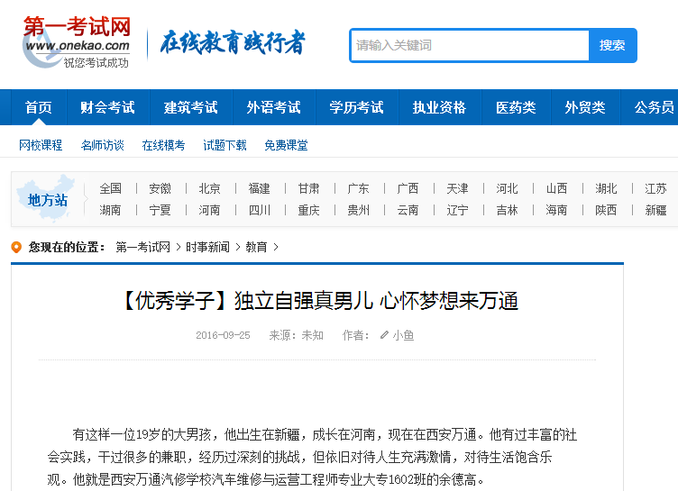 來到了西安萬通,余德高的適應能力很強,很快便融入到西安萬通的生活與學習之中,而且時間過得很快,轉眼之間已過了小半年的時間。在這段時間里,余德高在實訓技能的學習上能實事求是,不懂則問,所以對實訓技能的掌握很快也很扎實。也能積極的參與各種活動,就在近期,余德高便在2016西安萬通職業生涯規劃演講大賽上摘得第一名的榮譽。而且,余德高的空閑時間沒有用來嘻哈玩鬧,而是被他充分的利用了起來干各種兼職,比如服務員、發傳單、協警、物流分揀等?吹贸鰜,余德高雖然年齡不大,但是已經懂得怎樣去擔負責任、面對生活。