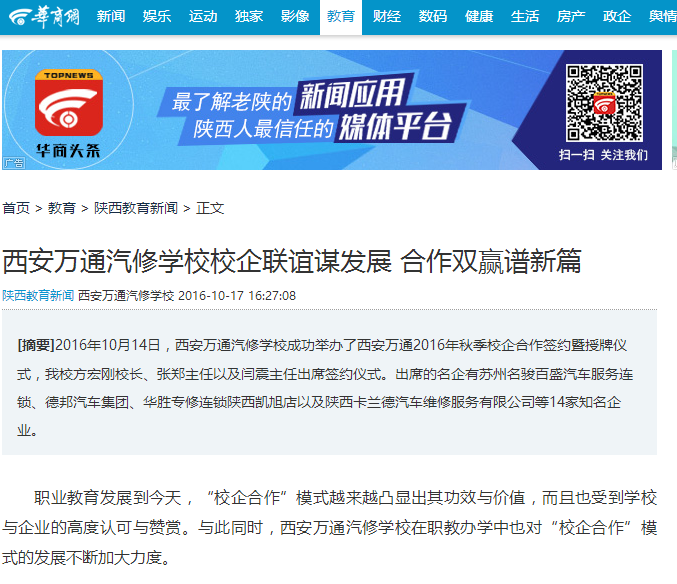 職業教育發展到今天,“校企合作”模式越來越凸顯出其功效與價值,而且也受到學校與企業的高度認可與贊賞。與此同時,西安萬通汽修學校在職教辦學中也對“校企合作”模式的發展不斷加大力度。