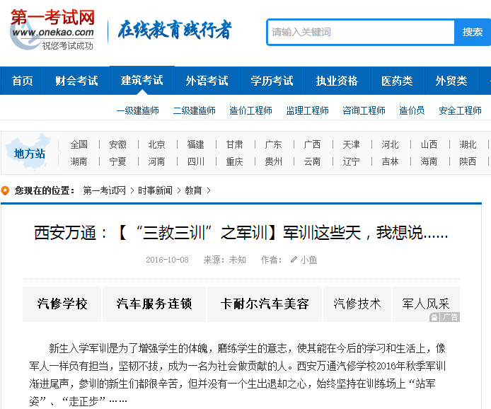 新生入學軍訓是為了增強學生的體魄,磨練學生的意志,使其能在今后的學習和生活上,像軍人一樣負有擔當,堅韌不拔,成為一名為社會做貢獻的人。西安萬通汽修學校2016年秋季軍訓漸進尾聲,參訓的新生們都很辛苦,但并沒有一個生出退卻之心,始終堅持在訓練場上“站軍姿”、“走正步”……