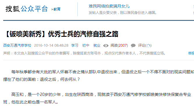 高玉和,是一個20歲的少年,出生在陜西商洛,現就讀于西安萬通汽修學校鈑噴美快修快保復合專業班,他在此之前也是一名軍人。