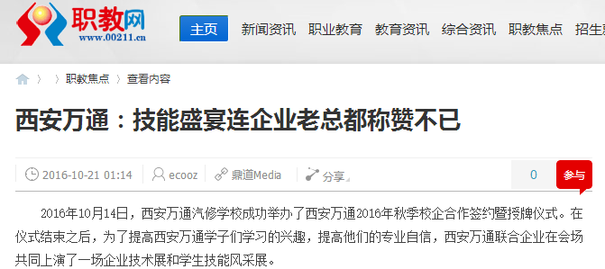2016年10月14日,西安萬通汽修學校成功舉辦了西安萬通2016年秋季校企合作簽約暨授牌儀式。在儀式結束之后,為了提高西安萬通學子們學習的興趣,提高他們的專業自信,西安萬通聯合企業在會場共同上演了一場企業技術展和學生技能風采展。