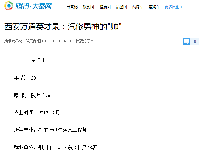 在2016年西安萬通汽修學校大型招聘會上,霍樂凱看中了銅川市王益區的東風日產4S店,隨后便到這家4S店里就職;魳穭P適應能力很強,很快便從學生的角色轉變成企業員工的身份,這肯定與他在學校里學得的專業技能知識分不開的,F在,霍樂凱已經成為車企配件的主管了,可謂是小有成就,不過霍樂凱的腳步還不止于此,他還有更高的追求。