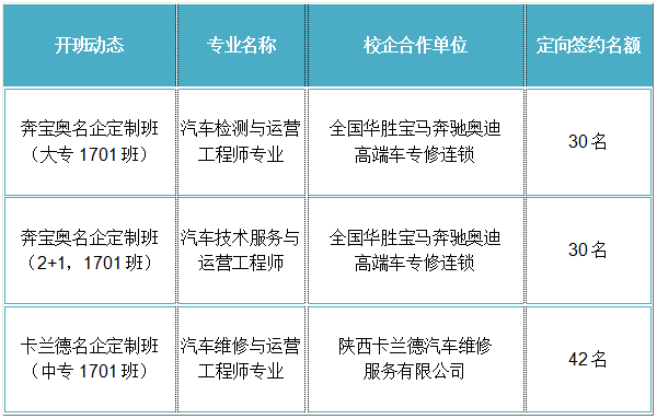 目前,西安萬通汽修學校應企業的用人需求,已開設2017華勝奔寶奧等名企定制班,限招30人,預報名窗口已經啟動,便迎來學子瘋搶名額。