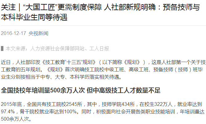 《規劃》系統闡述了“十三五”時期技工教育事業發展的4條基本原則、6大發展目標、10項主要指標、若干重點舉措。規劃亮點:技工院校預備技師將按本科學歷落實待遇。