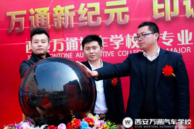 在全校師生與企方代表的共同見證下,方校長、周總、閆主任一起開啟啟動球,標志著西安萬通新專業正式推出。