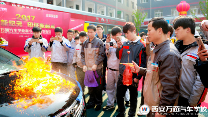 在新專業發布結束后,西安萬通還組織了一場新技術炫酷展示項目,所展示的新技術項目包括漆面鍍晶——大火燒車、輪輞彩印——水轉印、汽車改裝。