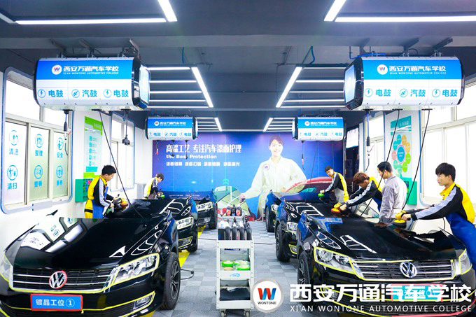 西安萬通汽車學校針對汽車美容技術,開設有汽車美容創業特訓班、汽車美容快修店長班、汽車鈑噴美技師班等定制班,學制為短短2.5-5個月不等,讓學子學會汽車美容保養以及創業全套知識,設置三段式課程體系:汽車美容學段段課程、汽車美容強化課程以及美容創業課程,循序漸進,涵蓋學子學習與就業,讓學子在學習專業技能的同時,也能了解創就業知識。學校踐行整車實訓理念,堅信只有多實操才能練出真本領,讓每個學子都能上手操作,老師一步步手把手教學,確保每個學生都能學到真本領。