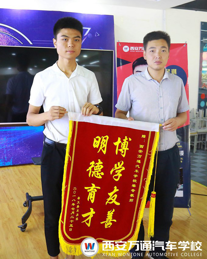最后,趁此再回母校之際,吳琦也為母校送來了一只錦旗,“博學友善 明德育才”,這不僅是對西安萬通教學質量的認可與肯定,也是對母校感激之情一種表達。