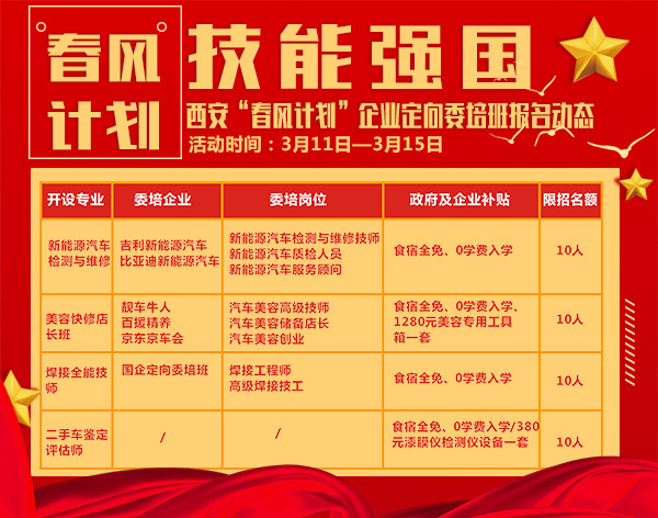 1:凡是在3月11日——3月15日,通過線上參觀預約,即可享受政府“春風計劃”名額,享受食宿全免、服裝、被褥學習用品等全免政策,0壓力入學學技術。
