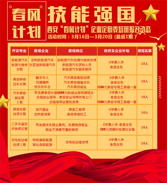 1:凡是在3月16日--3月20日,通過線上參觀預約,報名以上專業,即可享受政府“春風計劃 技能強國”第二批名額, 享受住宿全免、伙食補貼、服裝、被褥、學習用品等全免政策,0壓力入學學技術。|