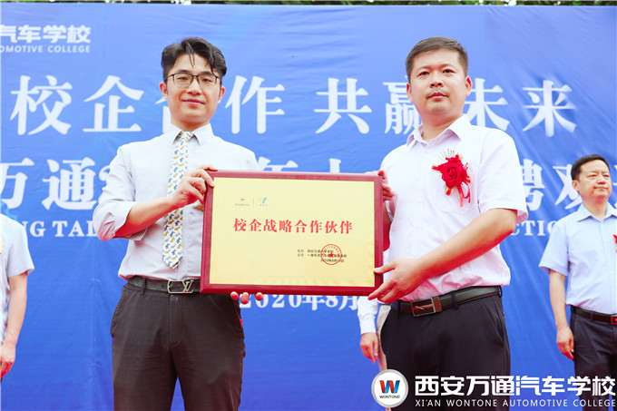 大會第二項,西安萬通汽車學校爨助與優質校企合作單位簽約儀式正式開始,西安優達汽車科技有限公司副總經理羅總和西安大象汽車銷售服務有限公司張總分別與我校簽訂2020年校企合作委培協議,達成校企合作共識,共同助力人才培養。