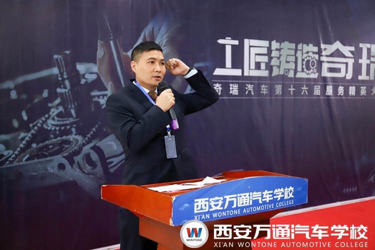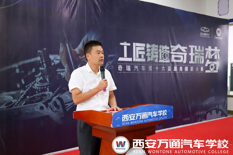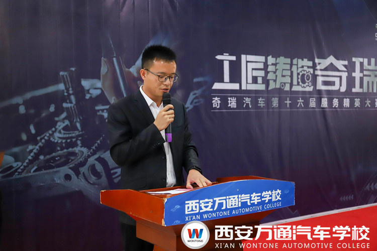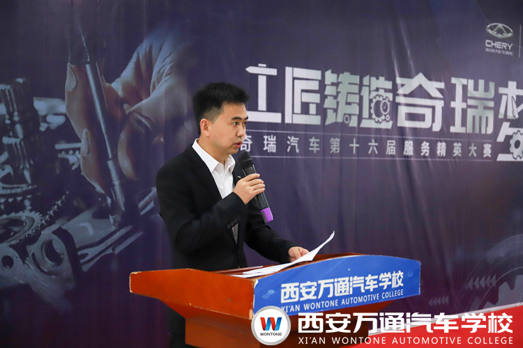 西安萬通校長助理鄭陸保鄭助致辭,萬通汽車教育與奇瑞汽車自2008年建立合作,雙方始終秉持校企融合,共育汽車英才的理念為廣大學子提供了更多工學交替、就業創業的機會。此次比賽是雙方校企合作的重要成果,通過舉辦服務技能大賽,不僅促進選手的進步,更能引領院校教學標準的提升!在此希望各位選手都能賽出水平、賽出風格,發揚工匠競賽,鑄造奇瑞萬通新輝煌。