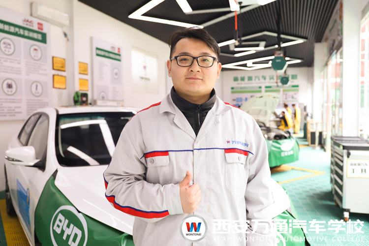 王旺,1996年,今年25歲,陜西渭南人,來萬通之前他是一家教育培訓機構的負責人,因為疫情影響教育行業,導致后來他轉行。因為家里人從事的行業都是電工,了解行業知識就推薦學習新能源方面的技能,偶然一次在朋友圈看到西安萬通的專業推薦,便在網上咨詢了解我們西安萬通,通過前期與咨詢老師的電話交流,王旺對萬通產生了興趣。并于今年8月31號來到萬通,在咨詢老師的帶領下,在學校進行實地考察就業、實訓基地等,第一次來萬通就被優美的校園環境和學校整車實訓室所吸引。