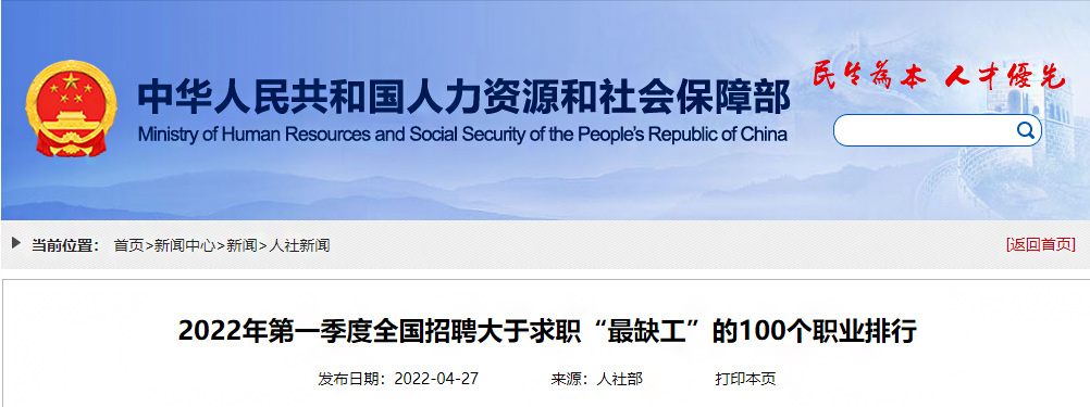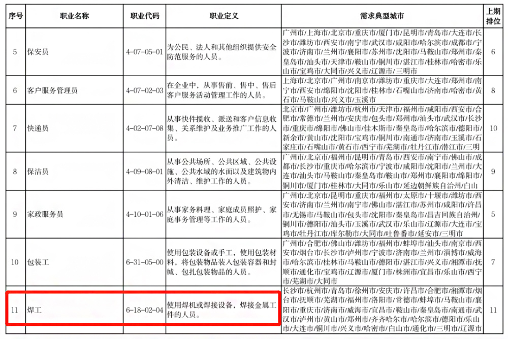 近期,人社部公布『2022年第一季度全國招聘大于求職“最缺工”的100個職業排行』,“焊工”高居短缺行業排名第11名。