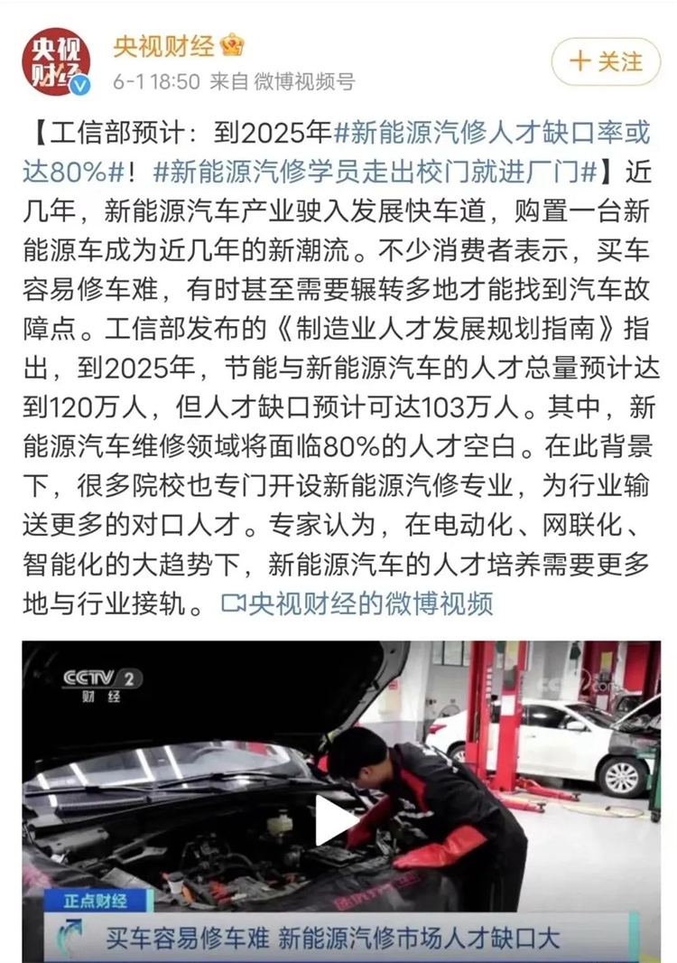 工信部預計:到2025年新能源汽修人才缺口率或達80%!