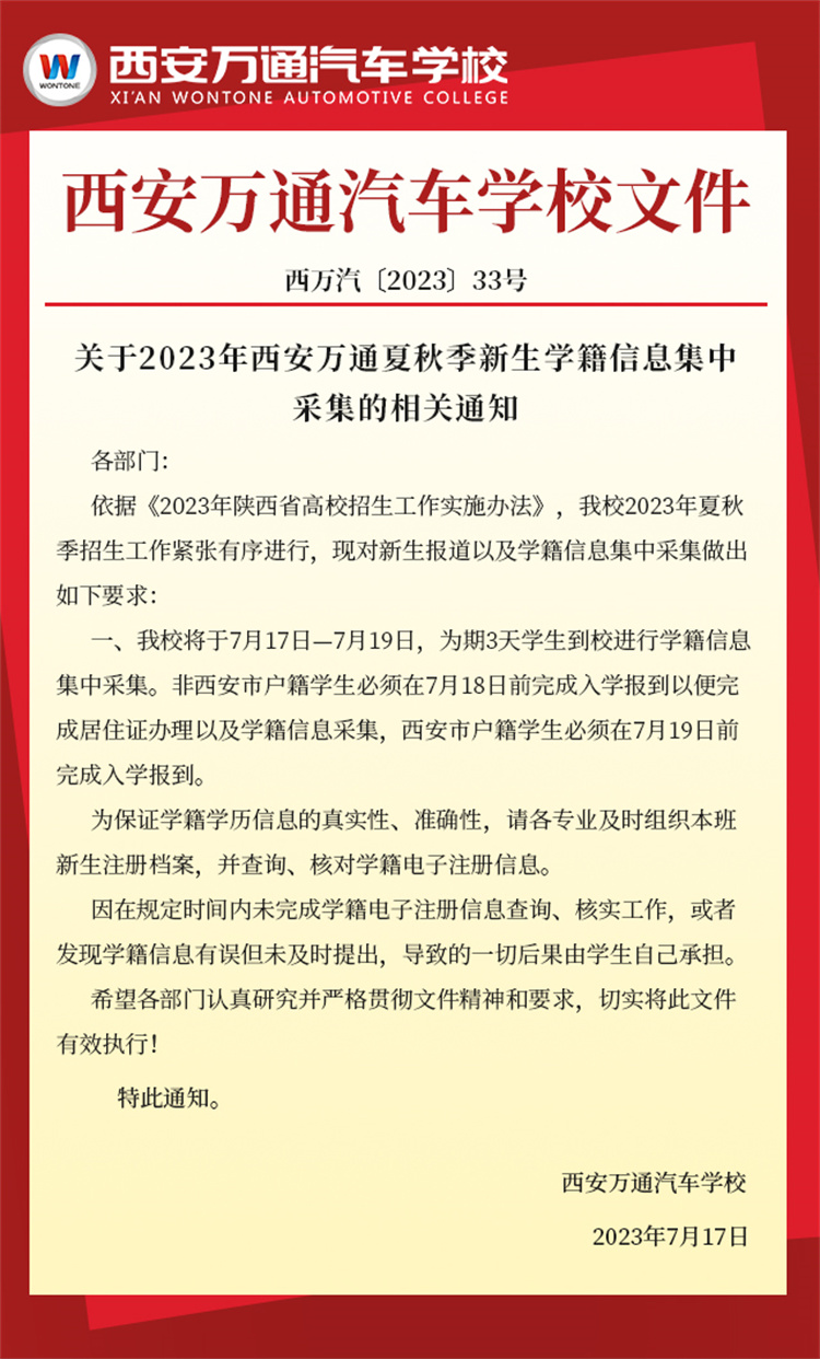 眾所周知,學籍注冊對于學生來說是非常重要的,它關乎到你是否有資格能夠在校學習。西安萬通汽車學校2023年新生秋季學籍注冊的具體時間為:7月17日—7月19日,如未及時搶報的學生只能等到明年統一注冊,意味著畢業證書比同期入學的小伙伴晚拿一年。早注冊,早拿證,早就業。