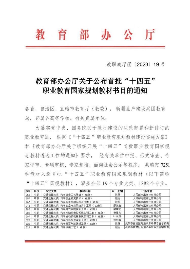 近日,根據教育部發布的《教育部辦公廳關于公布首批“十四五”職業教育國家規劃教材書目的通知》文件獲悉,由萬通汽車教育編寫的10本教材入選!這一重要榮譽標志著萬通汽車教育在汽車職業教育領域的貢獻得到了國家的認可與支持,將進一步推動汽車教育行業的規范化和專業化發展。