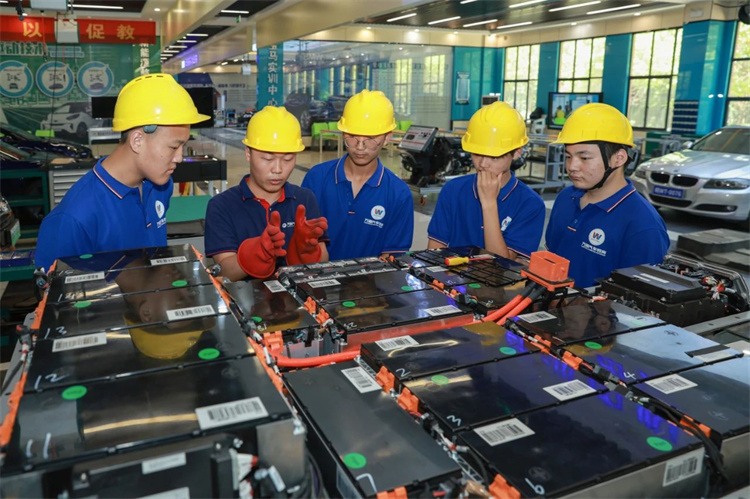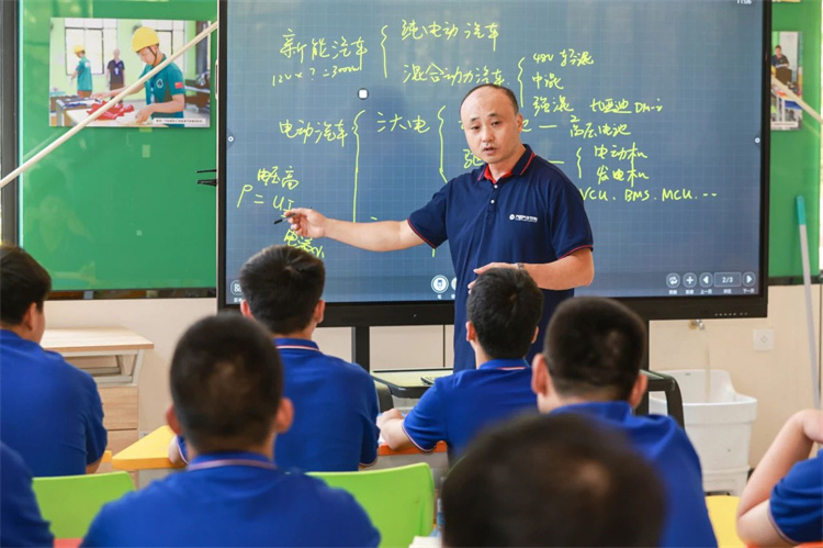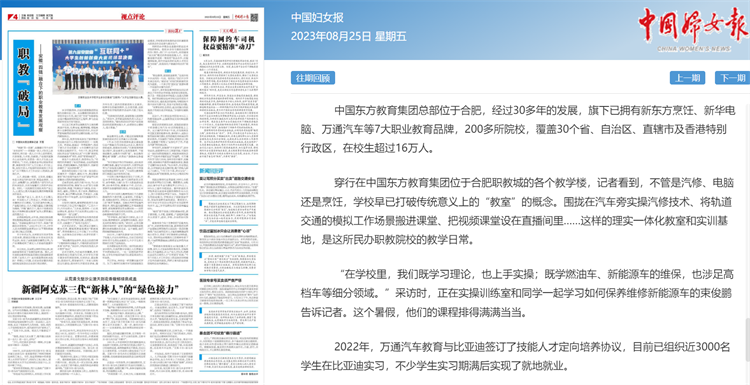 一、職業教育怎么教, 才能適應智能制造發展的需求? 萬通汽車教育作為中國東方教育集團旗下汽車職教品牌,經過30多年的發展沉淀,已在全國布局39所院校,常年在校生6萬人。 穿行在萬通的教學樓,學校早已打破傳統意義上的“教室”的概念,圍攏在汽車旁實操汽修技術、將軌道交通的模擬工作場景搬進課堂、把視頻課堂設在直播間里……這樣的理實一體化教室和實訓基地,是萬通汽車學校的教學日常。 “在學校里,我們既學習理論,也上手實操;既學燃油車、新能源車的維保,也涉足高檔車等細分領域。”正在實操訓練室和同學一起學習如何保養維修新能源車的束俊鵬這樣說。這個暑假,他們的課程排得滿滿當當。 2015年前后,萬通汽車的全國院校就陸續開設了新能源專業;5年前,智能網聯汽車專業正式招生;2022年,萬通汽車教育與比亞迪簽訂了技能人才定向培養協議,目前已組織近3000名學生在比亞迪實習,不少學生實習期滿后實現了就地就業。 無論是實訓設備、教學模式、產教融合、就業創業……萬通始終走在前列。