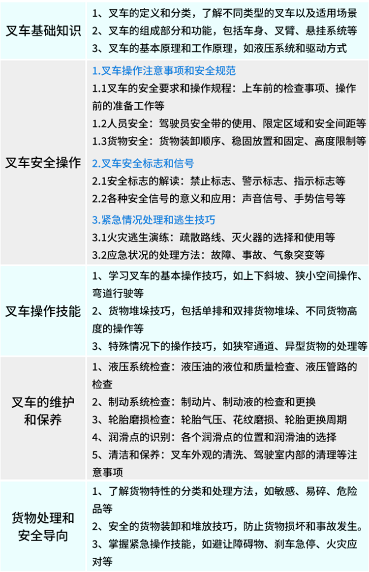 第二:專業特色 ①實訓實操為主,技術掌握快速扎實,投資回報比更好。 ②培訓時間短,階段性學習,專業培訓學習更透徹。 ③全面學習,熟練掌握叉車駕駛、維修、保養等多方面技術。 ④0基礎可學,培訓時間短,接受正規學習+考證培訓,轉行發展的首選。