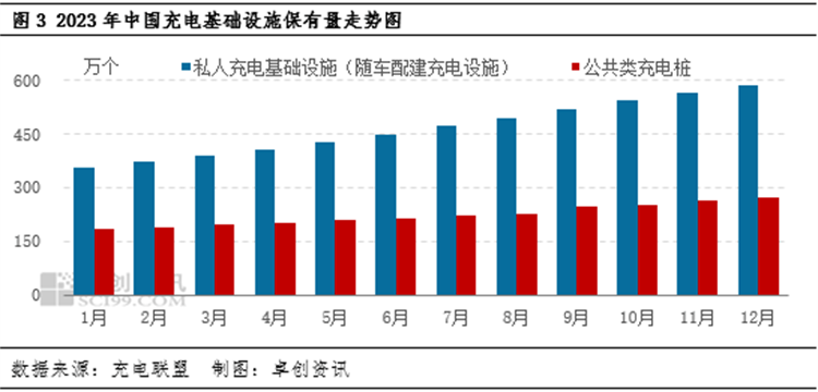 2023年,隨車配建充電設施及公共充電樁、換電站數量均出現明顯上漲。充電聯盟數據顯示,2023年1-12月,中國充電基礎設施增量為338.6萬臺,同比上漲30.6%;其中公共充電樁增量為92.9萬臺,同比上漲42.7%;隨車配建私人充電樁增量為245.8萬臺,同比上漲26.6%;換電站保有量增長至3567座。此外,針對新能源汽車在長途出行中所面臨的續航不足問題,高速服務區陸續進行充電樁建設,目前具備充電服務能力的高速服務區數量已經達到5978個,充電停車位近3萬個。 截至2023年12月,全國充電基礎設施累計數量為859.6萬臺,同比上漲65%;充電站保有量約為17萬座,同比上漲53%。