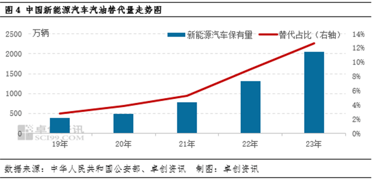 2023年中國汽油消費總量同比漲幅超7%。雖然汽油消費同比漲幅明顯,但新能源汽車快速發展始終是對汽油消費量形成偏空影響的因素,新能源汽車對汽油的替代作用依舊呈現明顯增長走勢。 目前我國普通家庭用車,主要以日常代步、周末短途自駕游、年假旅游以及走親訪友幾大作用為主,且日常代步為最主要所在,年平均行駛里程多在1萬-3萬公里,因此取中位數,2萬公里作為參考。油耗方面,結合汽車不同車型油耗及在市里及城郊、鄉鎮、高速等不同駕駛場景分析,采取百公里油耗為8L作為參考,2023年中國新能源汽車替代汽油量超2400萬噸,汽油替代占比近13%。