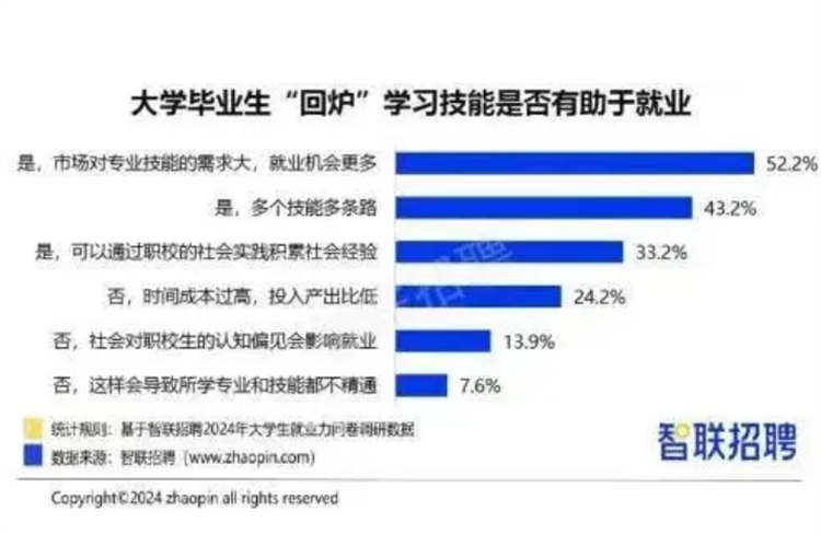 但是,我們必須承認“僅靠一張文憑就能換一個好工作的時代結束了”。 取而代之的“學歷+技能證書”成為不少大學畢業生求職時的標配,技能砝碼在當前的就業市場上明顯加重。 對于“回爐”學習技能是否有助于就業這一問題,52.2%的畢業生給出了肯定答案,認為市場對專業技能需求大,“回爐”后就業機會更多,占比最高。其次,43.2%認為多個技能多條路,33.2%認為可以以此積累社會經驗??梢?,多數畢業生對此表示贊同。