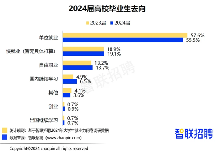 2024年畢業生的就業市場 1、畢業生就業求穩為主,面對充滿不確定的宏觀環境,畢業生找工作的“求穩”心態在持續加重,9成畢業生并不執著于找到“好工作”,找到工作就行; 2、畢業生求職行為更積極,求職時間提前,大四上半學期學期甚至更早開始找工作; 3、畢業生更加認可實習實踐經歷對求職的幫助; 4、畢業生“回爐”職校學技能趨勢明顯,希望獲得本科學歷和實用技能的雙重優勢,拓寬求職之路。