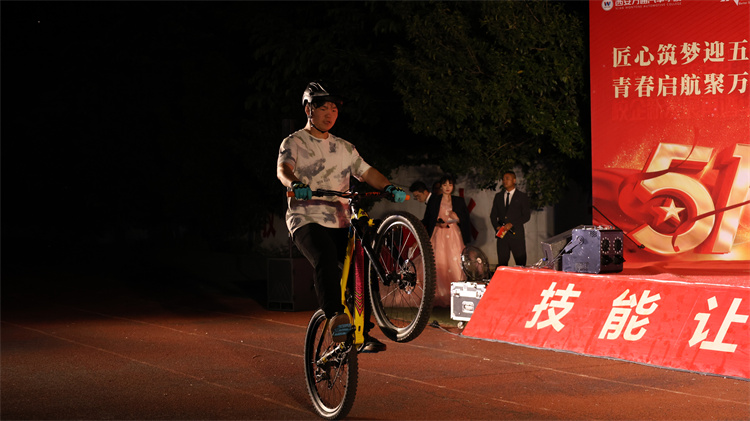晚會中,技能與藝術融合的節目尤為亮眼。新能源2501班的《散打表演》展現力量與技巧的完美結合,汽檢2401班嗩吶版《敢問路在何方》以傳統樂器奏響奮斗者心聲,新能源2302班的自行車特技表演更是以驚險動作詮釋了工匠精神的膽識與精準。
