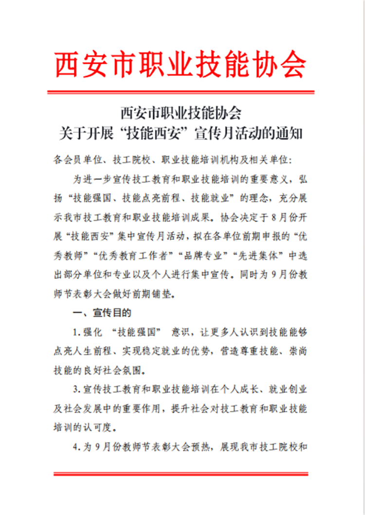 西安市職業技能協會發布了《關于開展“技能西安”宣傳月活動的通知》,旨在進一步弘揚“技能強國、技能點亮前程、技能就業”的理念,展示我市技工教育與職業技能培訓的豐碩成果。